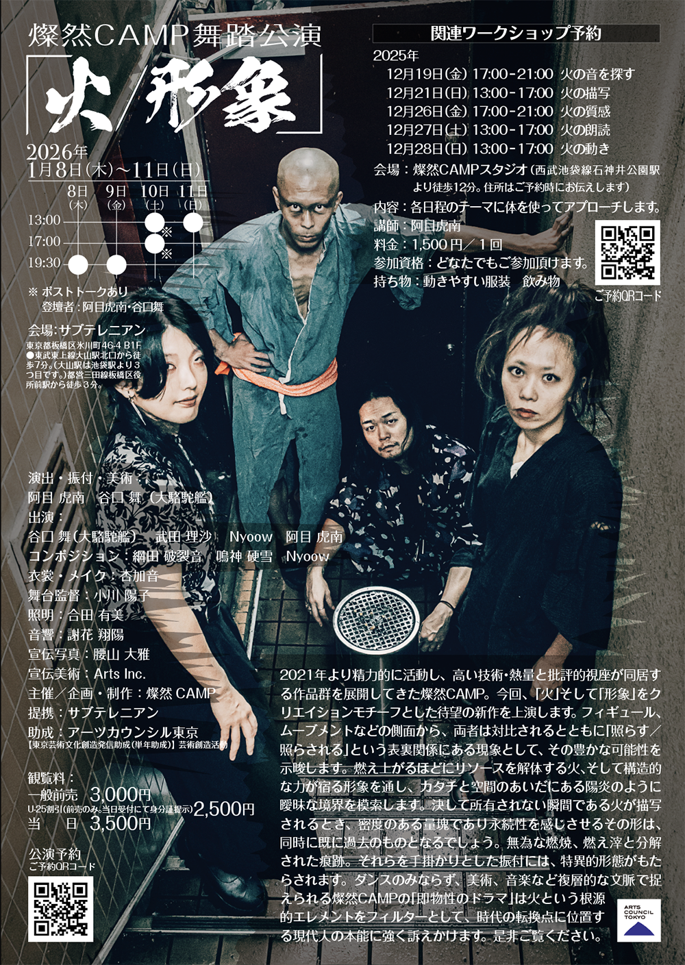 2021年より精力的に活動し、高い技術・熱量と批評的視座が同居する作品群を展開してきた燦然CAMP。今回、「火」そして「形象」をクリエイションモチーフとした待望の新作を上演します。フィギュール、ムーブメントなどの側面から、両者は対比されるとともに「照らす/照らされる」という表裏関係にある現象として、その豊かな可能性を示唆します。燃え上がるほどにリソースを解体する火、そして構造的な力が宿る形象を通し、カタチと空間のあいだにある陽炎のように曖昧な境界を模索します。決して所有されない瞬間である火が描写されるとき、密度のある量塊であり永続性を感じさせるその形は、同時に既に過去のものとなるでしょう。無為な燃焼、燃え滓と分解された痕跡。それらを手掛かりとした振付には、特異的形態がもたらされます。ダンスのみならず、美術、音楽など複層的な文脈で捉えられる燦然CAMPの「即物性のドラマ」は火という根源的エレメントをフィルターとして、時代の転換点に位置する現代人の本能に強く訴えかけます。是非ご覧ください。